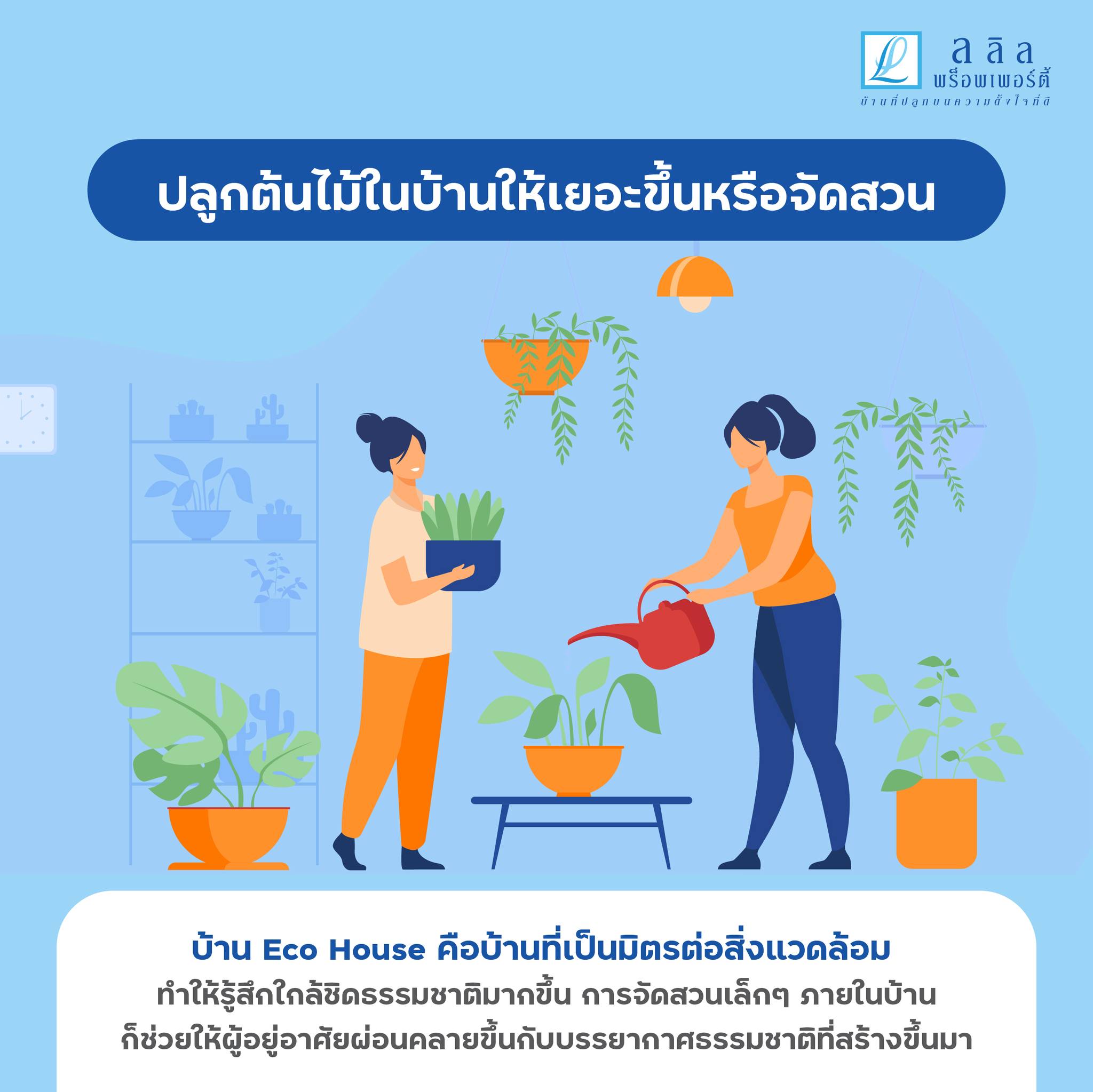 บ้าน Eco House คือบ้านที่เป็นมิตรต่อสิ่งแวดล้อม ทำให้รู้สึกใกล้ชิดธรรมชาติมากขึ้น การจัดสวนเล็กๆ ภายในบ้านก็ช่วยให้ผู้อยู่อาศัยผ่อนคลายขึ้นกับบรรยากาศธรรมชาติที่สร้างขึ้นมา
