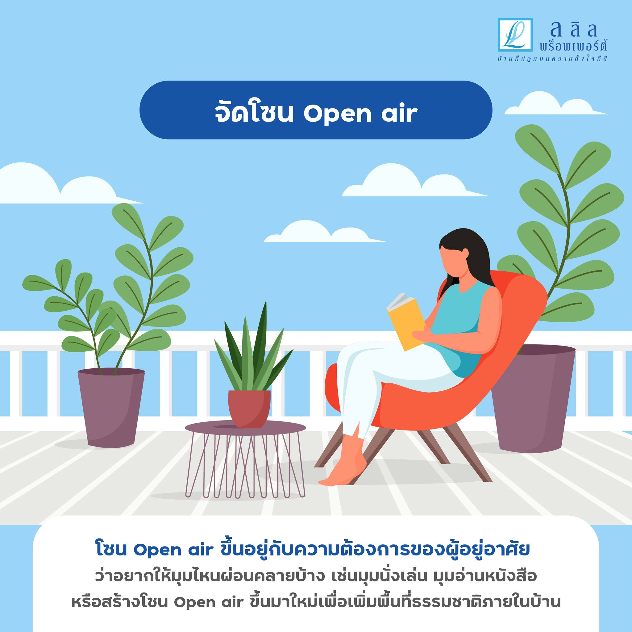 โซน Open air ขึ้นอยู่กับความต้องการของผู้อยู่อาศัย ว่าอยากให้มุมไหนผ่อนคลายบ้าง เช่น มุมนั่งเล่น มุมอ่านหนังสือ หรือสร้างโซน Open air ขึ้นมาใหม่เพื่อเพิ่มพื้นที่ธรรมชาติภายในบ้าน