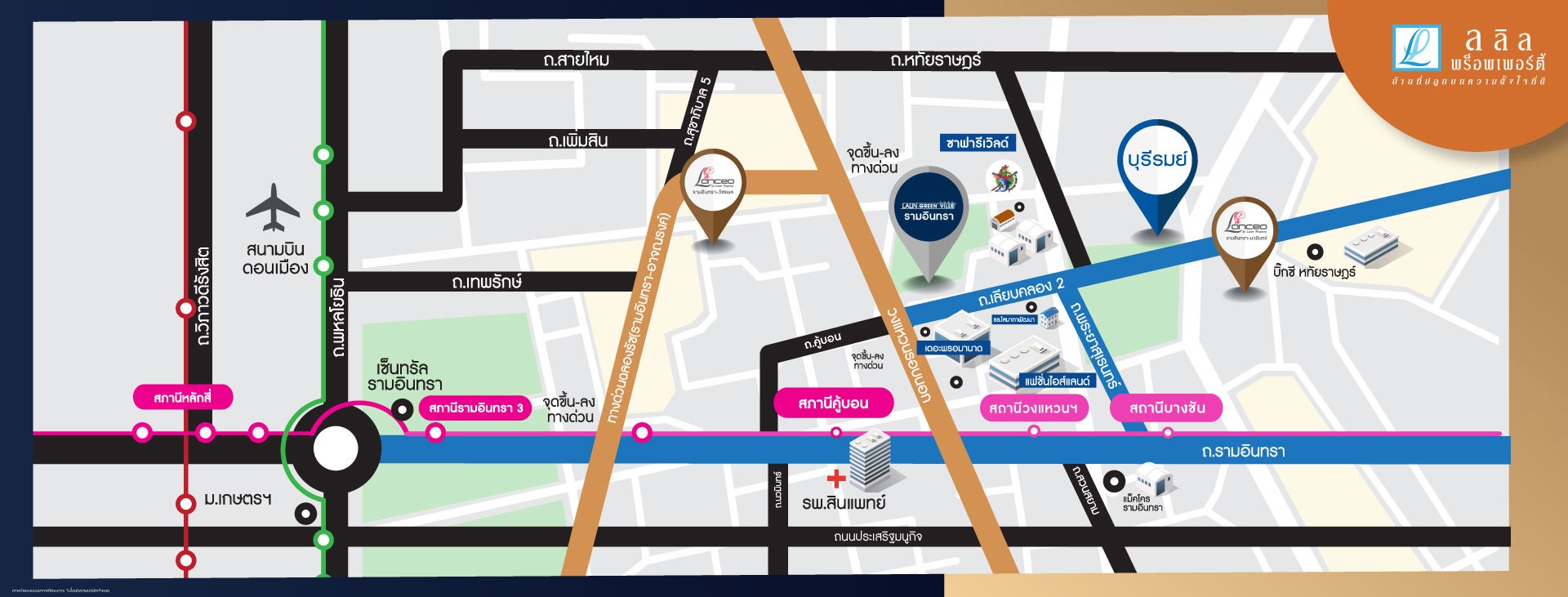 ทำเลที่ตั้งโครงการ Lanceo รามอินทรา – วัชรพล ถือเป็นโครงการบ้านหลังใหญ่ย่านรามอินทรา ที่ทำเลทองมากๆ เติมเต็มชีวิตคนเมือง เดินทางสะดวก ด้วยทำเลติดทางด่วน เชื่อมต่อถนนสายหลัก 2 สาย ทั้ง รามอินทราและพหลโยธิน ลัดสู่ใจกลางถนนแห่งธุรกิจทั้งลาดพร้าว พระราม 9 และสุขุมวิท ด้วยถนนเลียบทางด่วนเอกมัย-รามอินทรา พร้อมทั้งเชื่อมต่อรถไฟฟ้าสายสีชมพู สถานีวัชรพล