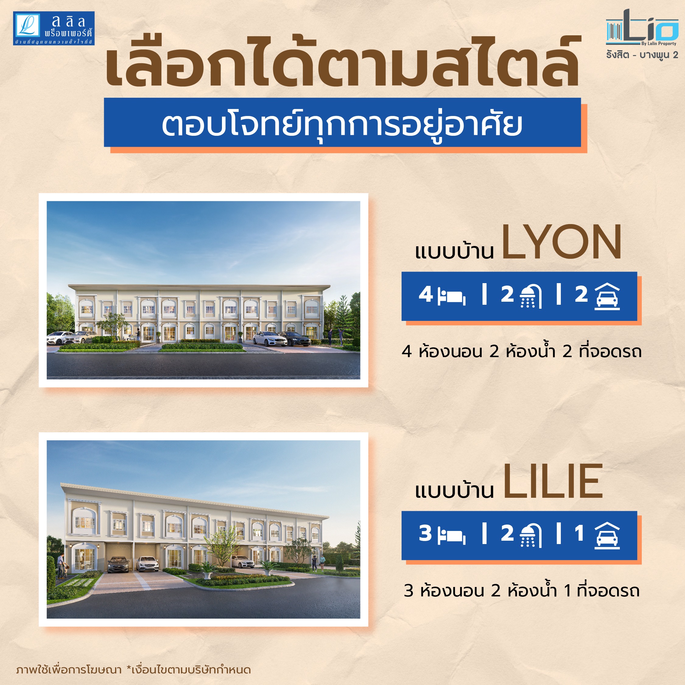 ทาวน์โฮมโครงการใหม่ Lio รังสิต – บางพูน2 ทาวน์โฮมใกล้รถไฟฟ้าสายสีแดง ด้วยดีไซน์แบบ French Colonial Style ออกแบบสไตล์ฝรั่งเศส โดดเด่นด้วยฟังก์ชั่นที่ลงตัวสามารถตอบรับวิถีชีวิตแบบใหม่ ด้วยพื้นที่ใช้สอยขนาดใหญ่ หน้ากว้าง 5.7 เมตร และสิ่งอำนวยความสะดวกแบบครบครัน ทั้งพื้นที่สีเขียวส่วนกลางขนาดใหญ่ และคลับเฮ้าส์ โดยถูกถ่ายทอดการออกแบบที่งดงาม ที่จะทำให้คุณจะได้สัมผัสความสุขแบบเรียบง่ายอย่างแท้จริง รายละเอียดโครงการเพิ่มเติม คลิก