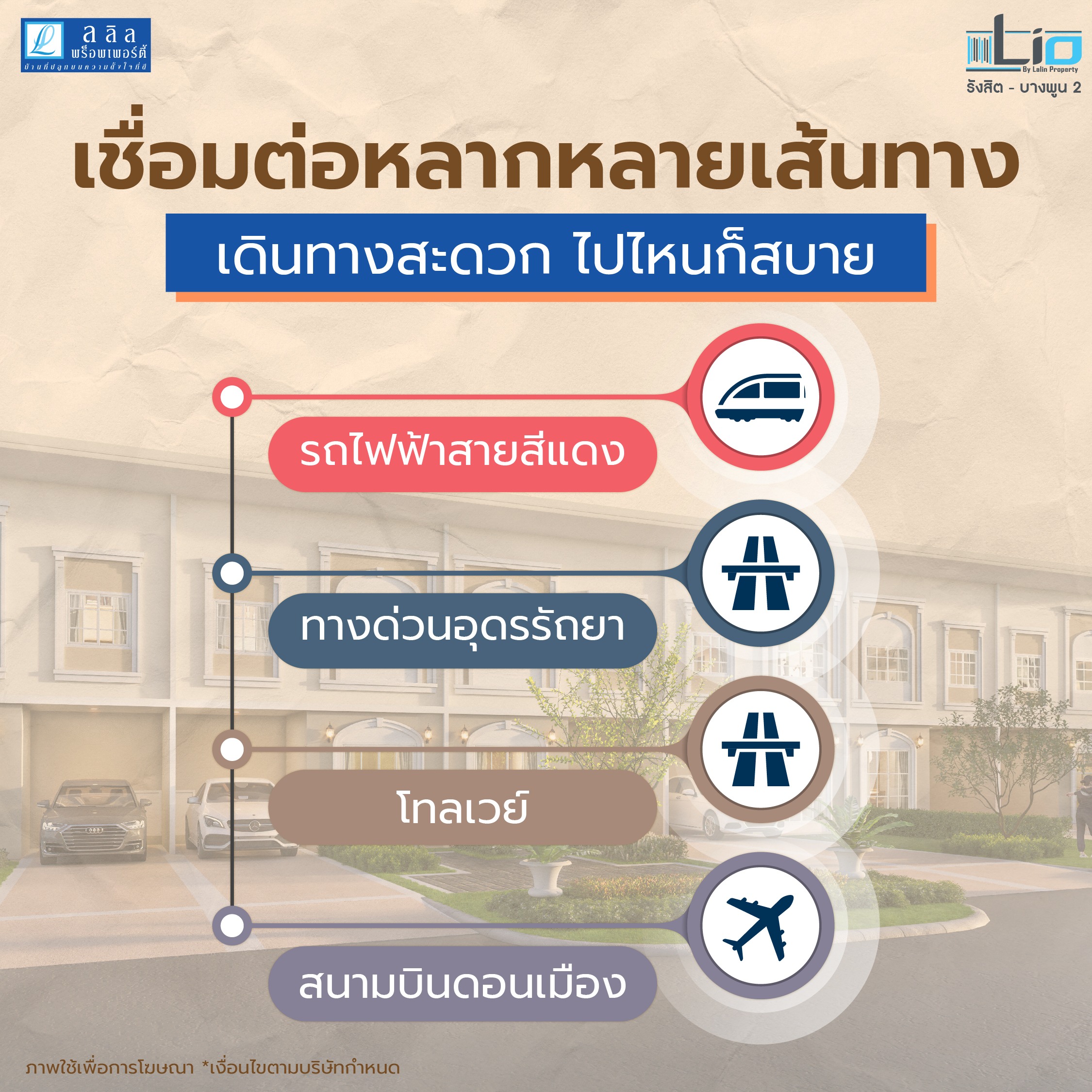 เชื่อมต่อหลากหลายเส้นทาง ด้วยศักยภาพด้านการคมนาคมที่สมบูรณ์แบบ ทำให้ Lio รังสิต – บางพูน2 ที่เป็นทาวน์โฮมย่านบางพูนตอบโจทย์ทุกการเดินทาง ไปไหนก็สบาย เชื่อมต่อเข้าเมืองได้สะดวก