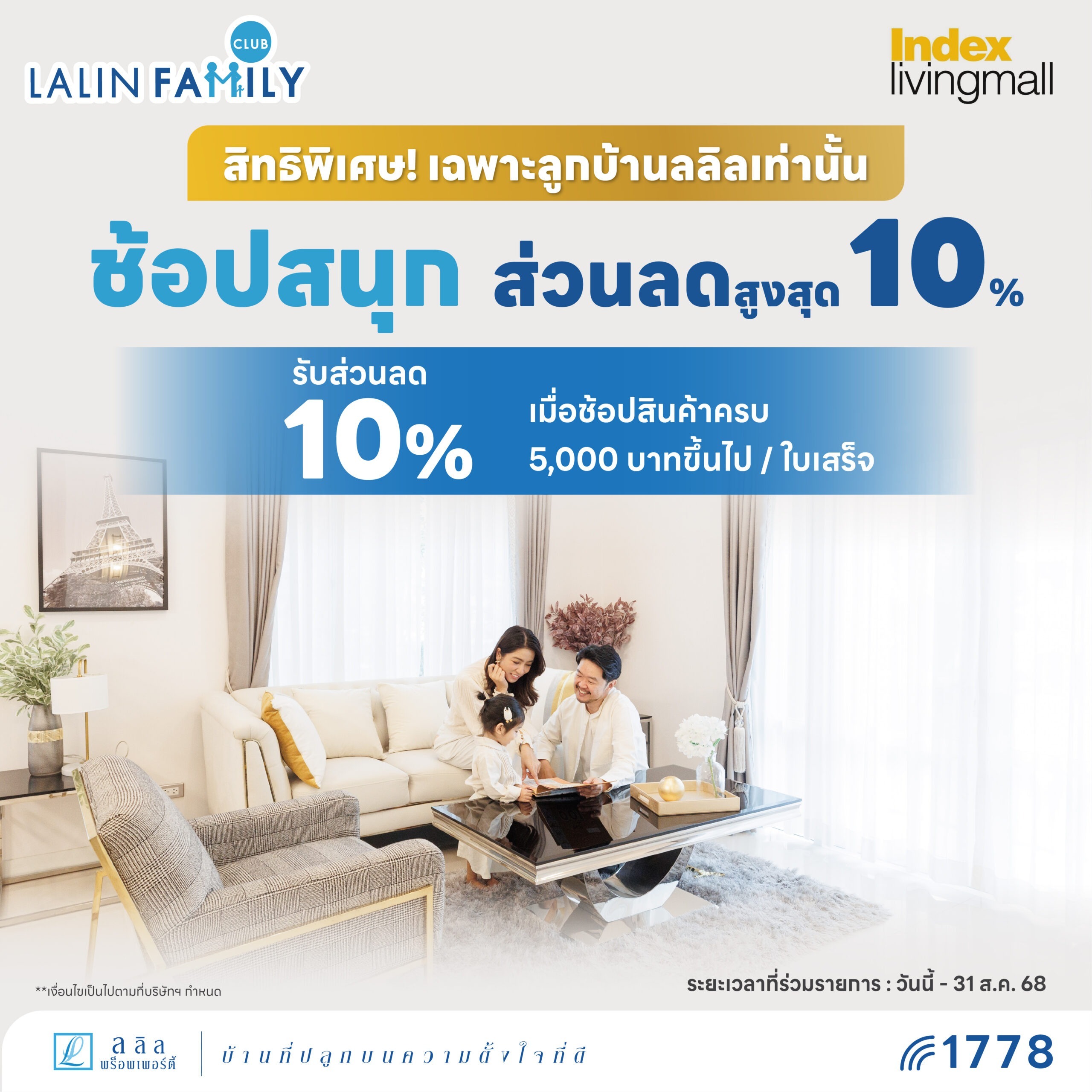 🎁 สิทธิพิเศษ! สำหรับลูกบ้านลลิล พร็อพเพอร์ตี้ เท่านั้นพบกับโปรสุดคุ้มจาก Index Living Mall x Lalin Property 2025🛒 ช้อปสนุกกับเฟอร์นิเจอร์และของแต่งบ้าน พร้อมรับส่วนลดทันที 10%เมื่อช้อปครบ 5,000 บาทขึ้นไป / ใบเสร็จ