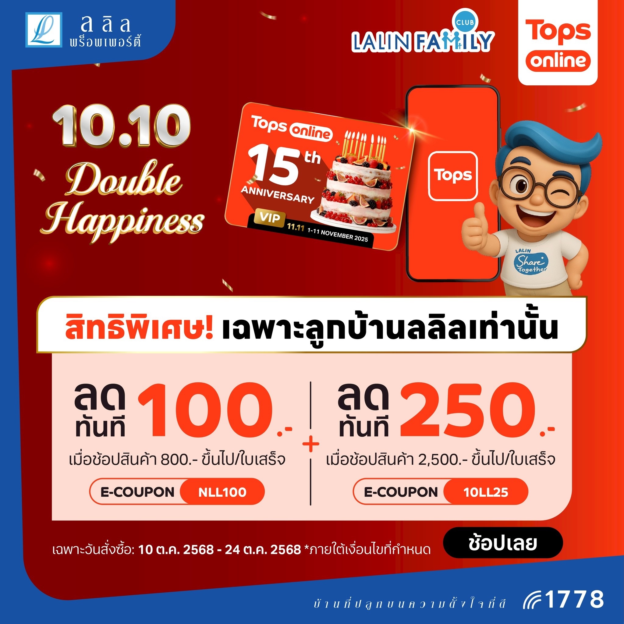 • โปรโมชั่นนี้สำหรับการสั่งซื้อผ่านท็อปส์ ออนไลน์เว็บไซต์และแอปพลิเคชัน เฉพาะสั่งซื้อภายในวันที่ 10 ตุลาคม 2568 – 24 ตุลาคม 2568 เท่านั้น