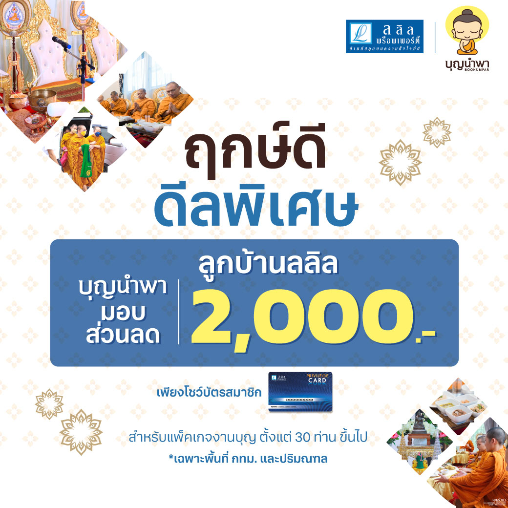 บุญนำพา มอบส่วนลดมูลค่า 2,000 บาท แพคเกจจัดงานบุญสำหรับ 30 ท่านขึ้นไป *พื้นที่จัดงาน กทม และ ปริมณฑล เพียงแค่โชว์บัตรสมาชิกลลิล ตั้งแต่วันนี้ – 31 ธันวาคม 2566 ติดต่อสอบถาม :Facebook : boonumpar line : @boonumpar หรือ https://lin.ee/A1kO9M5 โทร. 0891454922 / 0829661999 / 021019296ข้อมูลแพคเกจ 30 ท่าน นิมนต์ และ รับส่ง พระสงฆ์ พร้อมผู้ดำเนิน พิธี อุปกรณ์ พิธีสงฆ์ ครบชุด พระสงฆ์ 9 รูป แขกร่วมงาน 21 คน พวงมาลัย ดอกไม้สด ชุดสังฆทาน ชุตภัตตาหาร และ อาหารสำหรับแขก อาหารคาว 5 รายการ ขนมหวาน 1 อย่าง น้ำสมุนไพร 1 อย่าง ฟรี! น้ำแข็ง น้ำเปล่า ข้าวหอมมะลิ และผลไม้ตามฤดูกาล ให้ภายในแพ็คเกจ