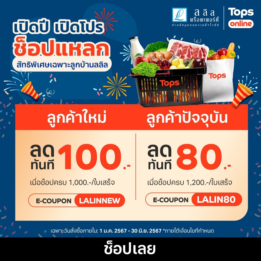 • โปรโมชั่นนี้สำหรับการสั่งซื้อผ่านท็อปส์ ออนไลน์เว็บไซต์และแอปพลิเคชัน เฉพาะสั่งซื้อภายในวันที่ 1 มกราคม 2567 – 30 มิถุนายน 2567 เท่านั้น