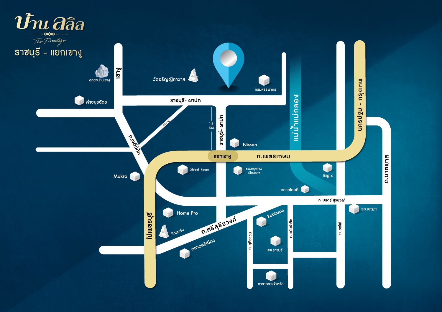 “บ้านลลิล เดอะเพรสทีจ เพชรเกษม-แยกเขางู” ตั้งอยู่บนทำเลที่มี บนถนน ราชบุรี-ผาปก ที่สามารถเดินทางเข้าสู่ศูนย์ราชการใจกลางเมือง สถานศึกษา โรงพยาบาล ห้างสรรพสินค้า ตลาด แหล่งงาน นิคมอุตสาหกรรมราชบุรี หรือ จะไปพักผ่อนย่อนใจที่อุทยานเขาหินงู ก็เดินทางเข้า-ออกได้อย่างสะดวกสบาย