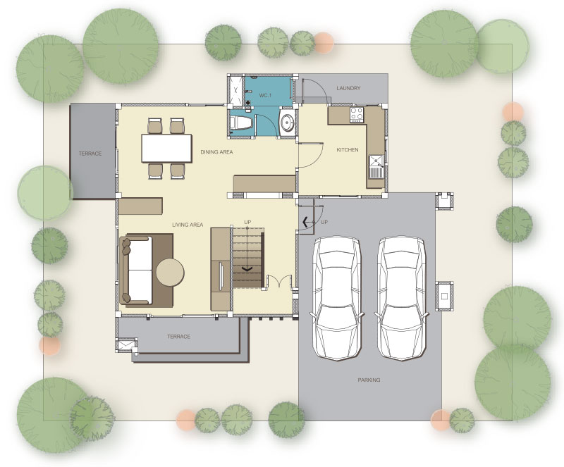 บ้านเดี่ยว พื้นที่เริ่มต้น 70 ตร.วา ขนาดพื้นที่ใช้สอย 220 ตร.ม. 5 ห้องนอน 4 ห้องน้ำ 1 ห้องคนรับใช้ พื้นที่ห้องครัวแยกเป็นสัดส่วน ห้องรับแขก ห้องเก็บของ ห้องแต่งตัว ห้องทำงานชั้นบน (เฉพาะแบบพิเศษ) และที่จอดรถ 2 คัน