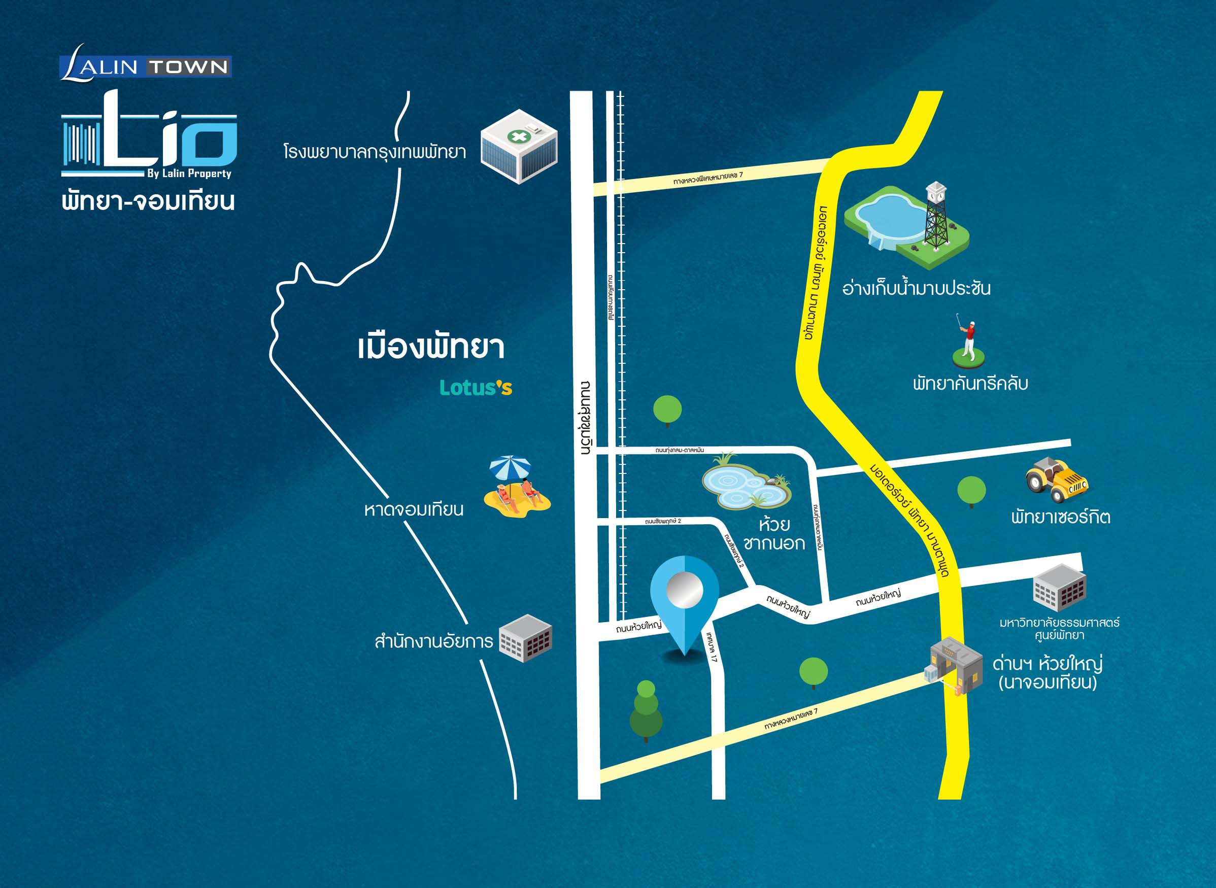 โครงการ ลลิลทาวน์ ไลโอ พัทยา – จอมเทียน โครงการตั้งอยู่ บนถนนเทศบาล1 ซอย12 ตำบลห้วยใหญ่ อำเภอบางละมุง จังหวัดชลบุรี เดินทางสะดวกจากถนนสุขุมวิท และ มอเตอร์เวย์ พื้นที่ห้วยใหญ่เป็นพื้นที่มีศักยภาพเหมาะสำหรับอยู่อาศัยที่เติบโตอย่างรวดเร็วในเขตชานเมืองพัทยา-จอมเทียน