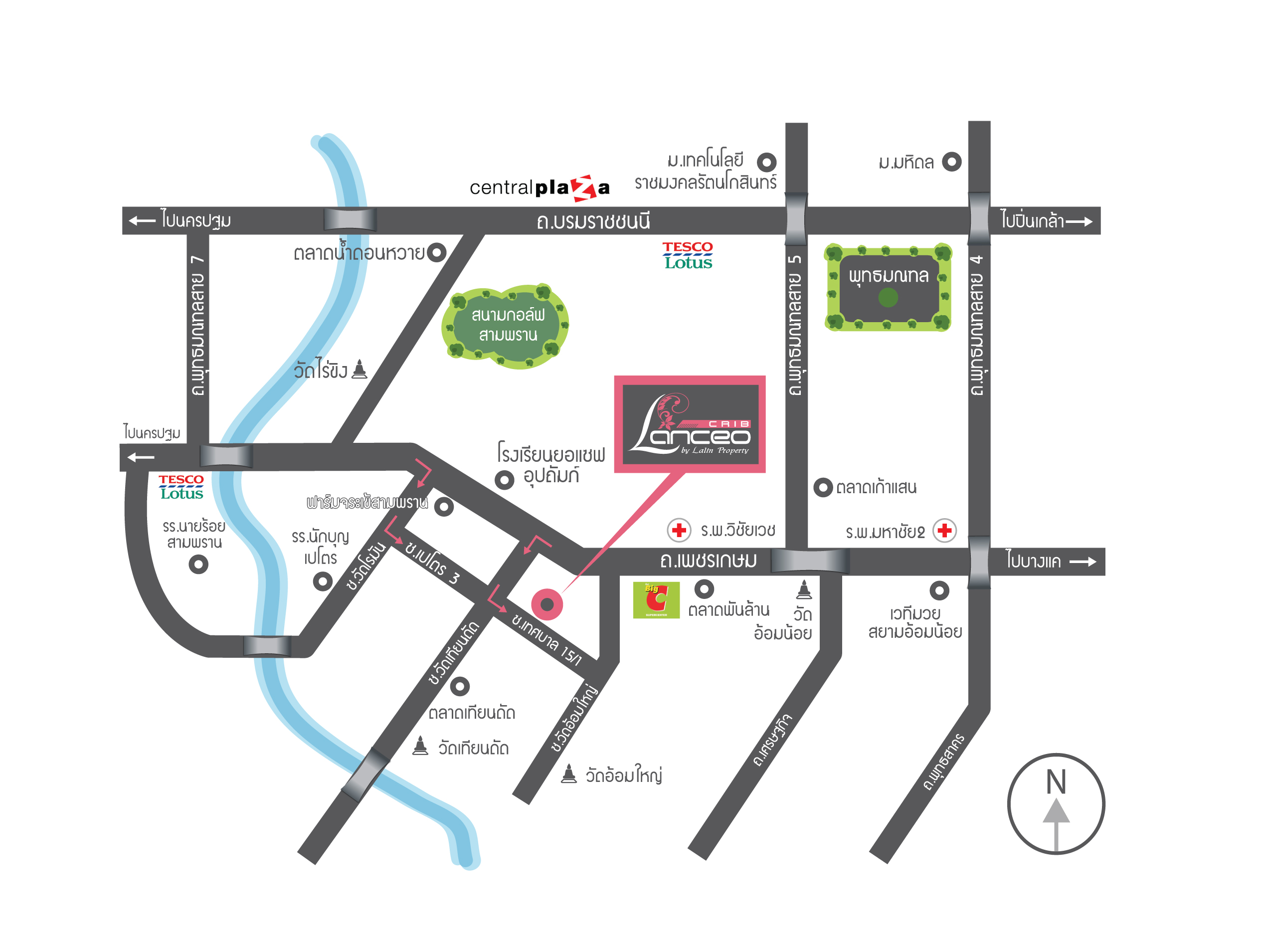 -จากถนนเพชรเกษม ผ่านแยกพุทธสาคร ขึ้นสะพาน วิ่งตรงไปทางนครปฐม ผ่านบิ๊กซีอ้อมใหญ่ ตลาดพันล้าน ไปจนถึงสี่แยกไฟแดงเทียนดัด ให้เลี้ยวซ้ายเข้าไปในซอยเทศบาล(เทียนดัด) ขับไปประมาณ 400 ม. เลี้ยวซ้ายเข้าซอยเทศบาล 15/1 ประมาณ 500 ม. โครงการจะอยู่ด้านซ้ายมือติดถนนหลัก