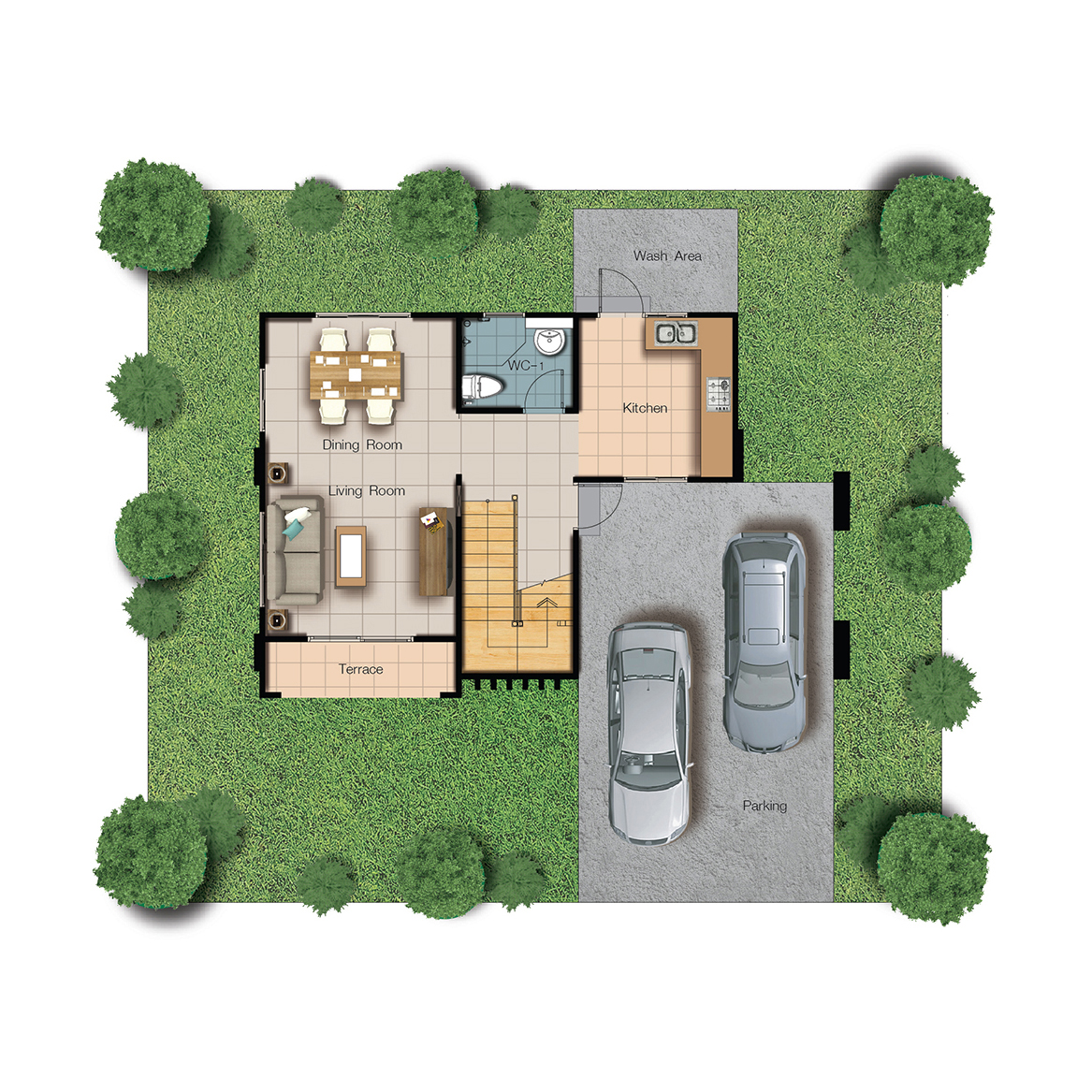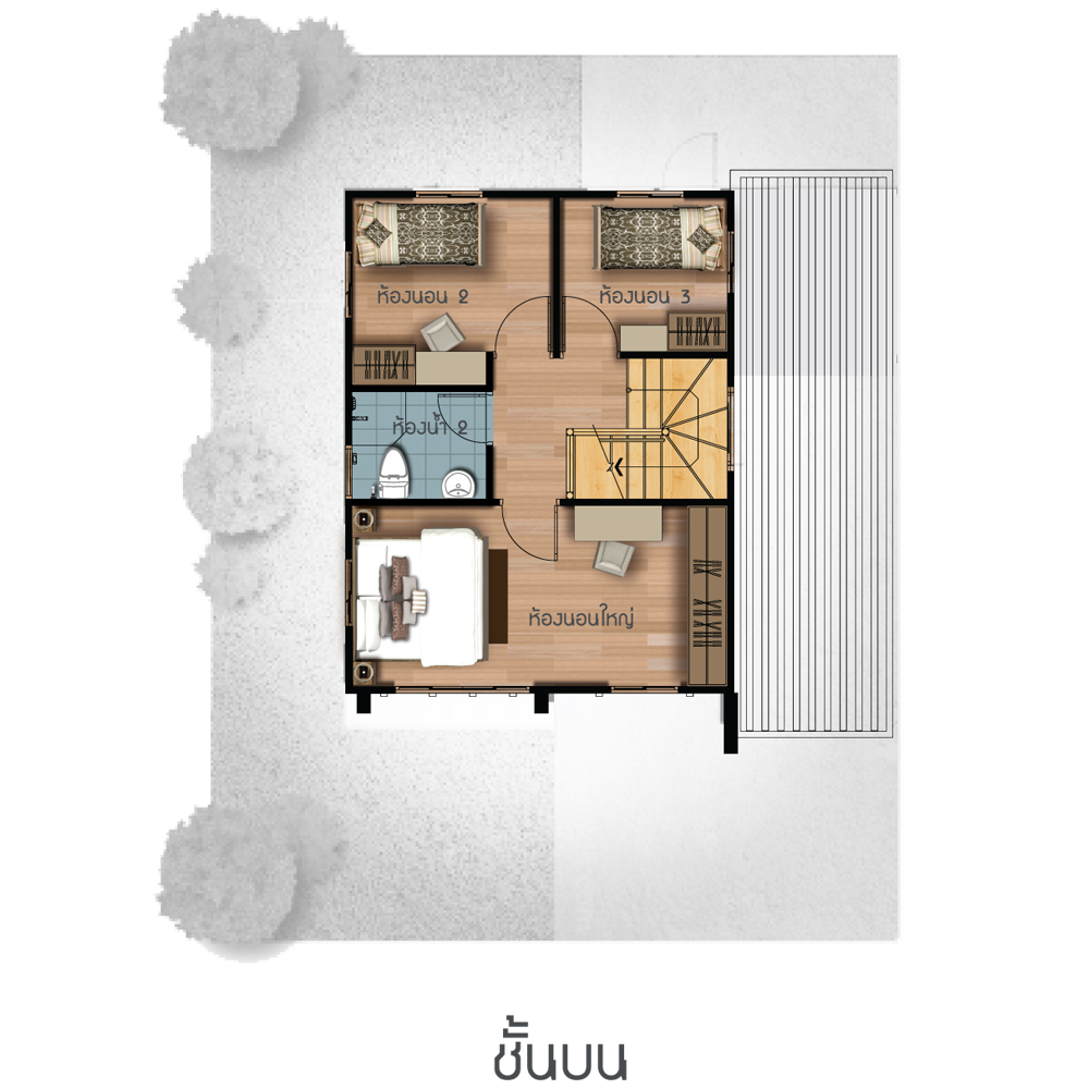 บ้านเดี่ยว พื้นที่ใช้สอย 155 ตร.ม. 3 ห้องนอน 2 ห้องน้ำ 1 ห้องรับแขก 1 ห้องรับประทานอาหาร ครัวแยกสัดส่วน เคาน์เตอร์เตรียมอาหาร ระเบียงชมวิว และที่จอดรถ 2 คัน
