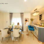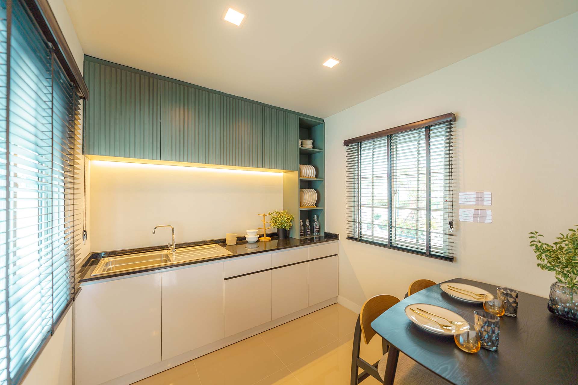 มองทะลุผ่านจากพื้นที่ Living room จะเจอกับส่วนรับประทานอาหารสามารถวางโต๊ะรับประทานอาหาร 4 ที่นั่ง สบายๆ ได้เลย แต่สามารถปรับเปลี่ยนวางเป็นโต๊ะตัวกลมได้ เพื่อรองรับจำนวนสมาชิกที่มากขึ้นได้ ถัดมาจะมีมุมเคาท์เตอร์สำหรับจัดเตรียมอาหาร และ พื้นที่ทำครัวแบบเปิด