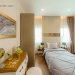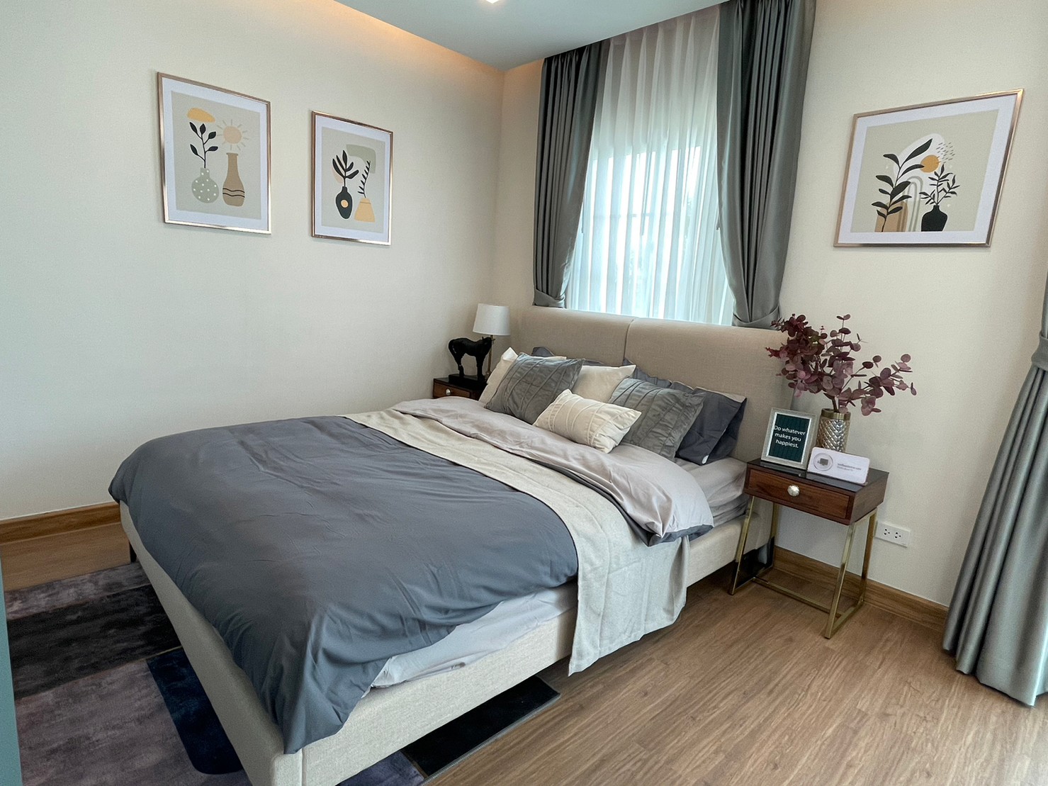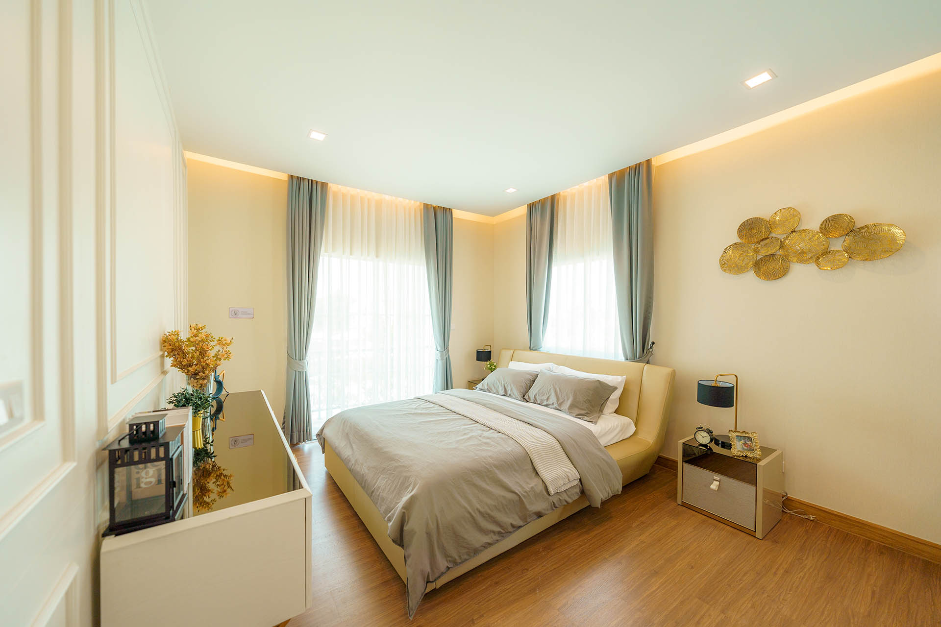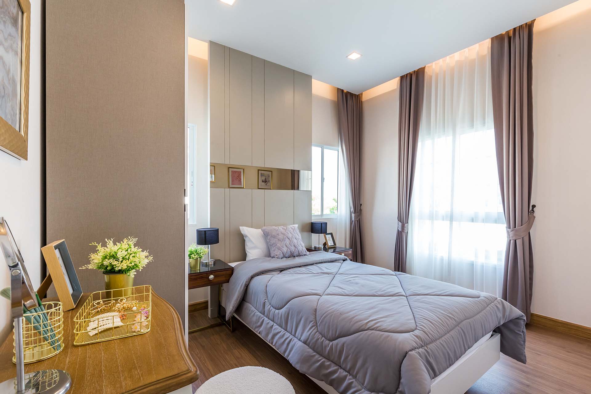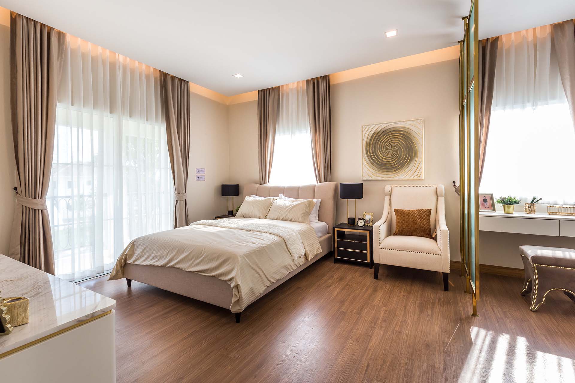 ห้องแรกที่จะพามาดูคือห้อง Master Bedroom ซึ่งจะกินพื้นที่ในส่วนของด้านหน้าบ้านทั้งหมด และมีพื้นที่ใช้สอยมากที่สุด ด้านหน้ามีประตูบานเลื่อนเชื่อมต่อไปยังระเบียงหน้าบ้าน และหน้าต่างกระจกขนาดใหญ่ ทำให้ห้องดูโปร่งโล่ง ขนาดเตียงสามารถวางเตียงขนาดใหญ่ 6 ฟุตได้สบายๆ มุมด้านข้างซ้าย-ขวาวางโต๊ะหัวเตียง หรือจัดเป็นมุมนั่งเล่นเหมือนที่ทางโครงการจัดไว้ให้ดูเป็นตัวอย่างได้เช่นกัน