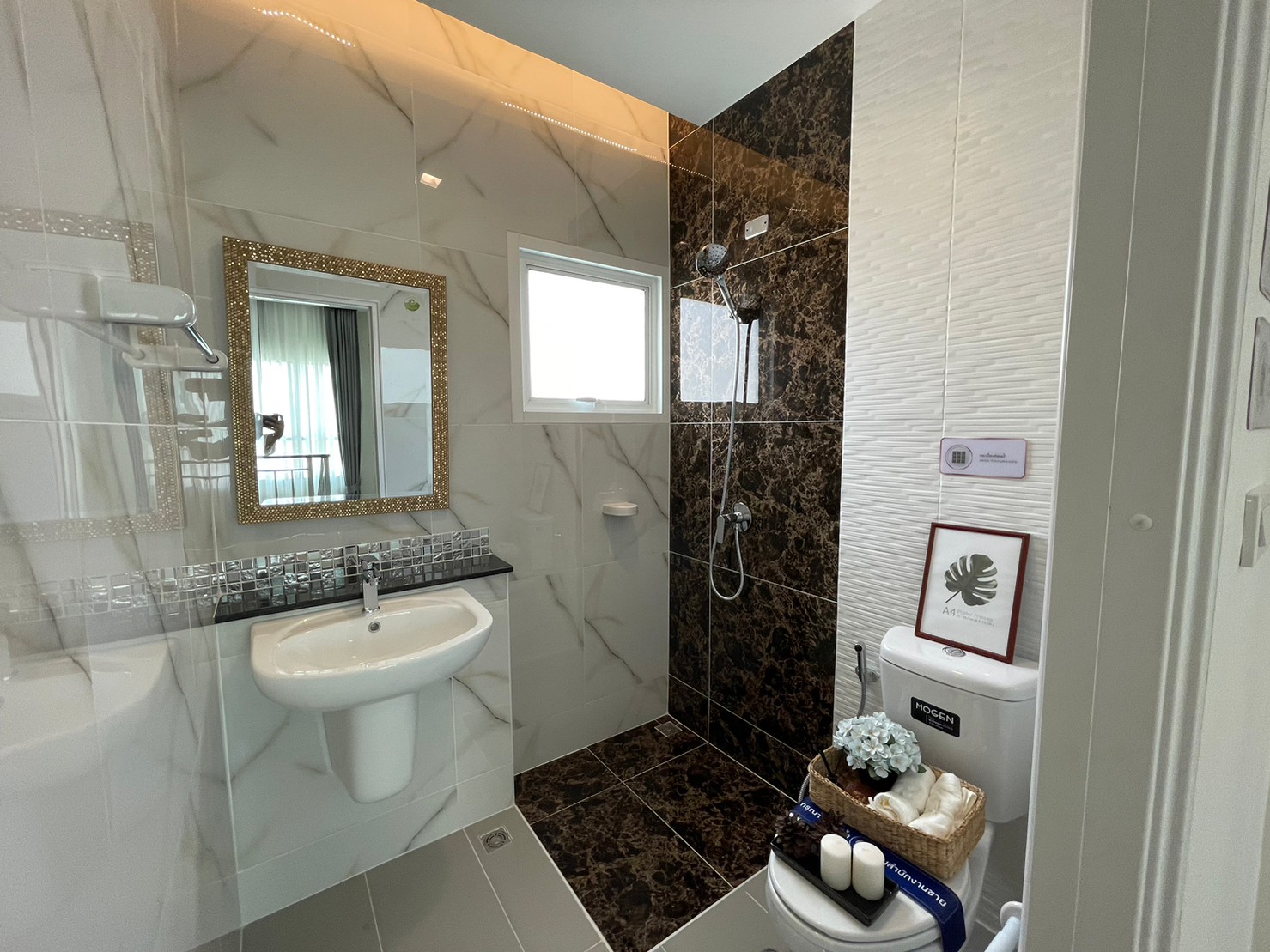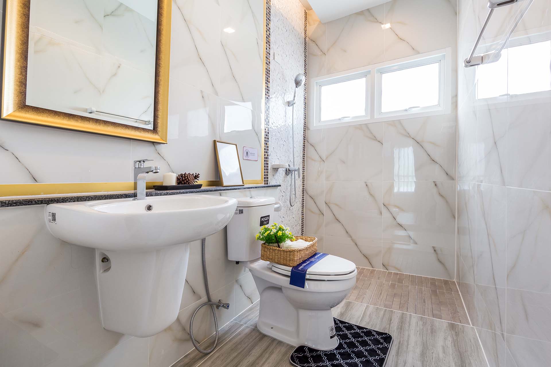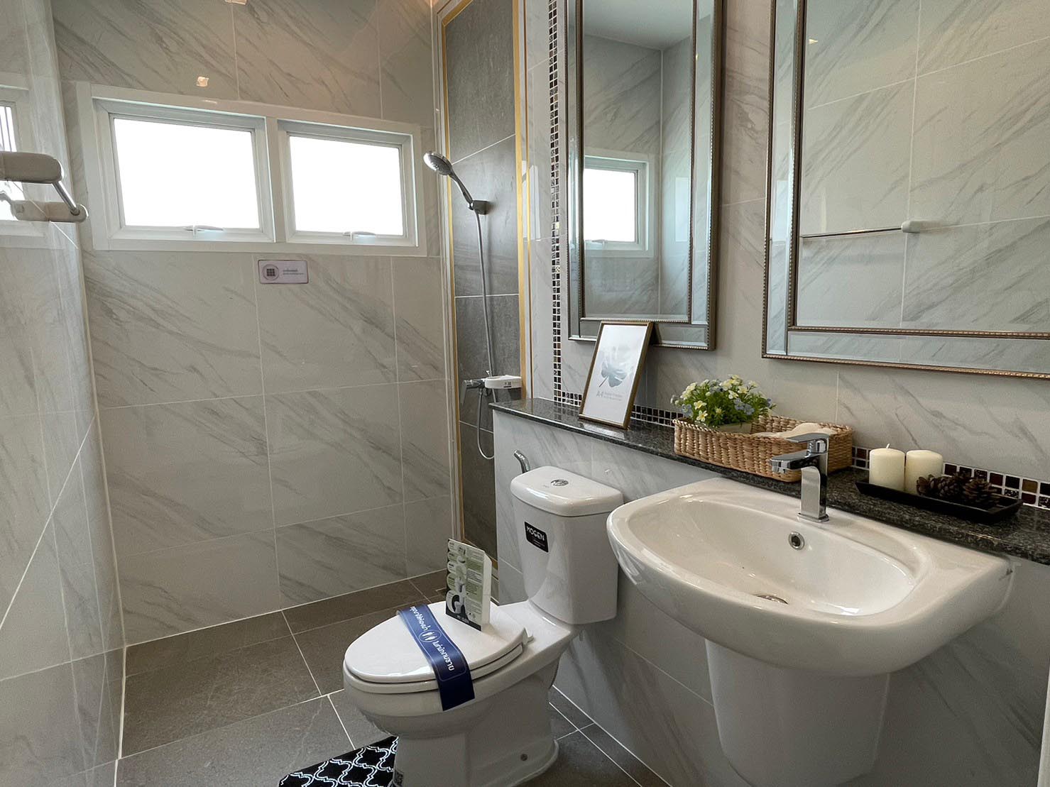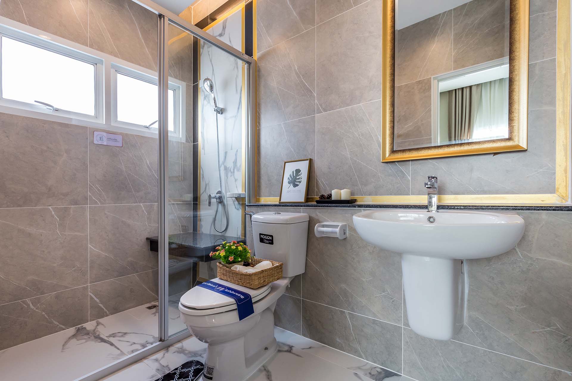 เนื่องจากห้อง Master Bedroom มีพื้นที่ใช้สอยมาก จึงได้ห้องน้ำส่วนตัวบริเวณในห้องเลย แบ่งส่วนเปียกแห้งไว้ให้ชัดเจน และได้ติดตั้งฉากกั้นอาบน้ำไว้ให้ด้วย ภายในห้องน้ำจะปูกระเบื้องลายหินอ่อนสีขาว ดูหรูหรา น่าใช้งานมากๆ