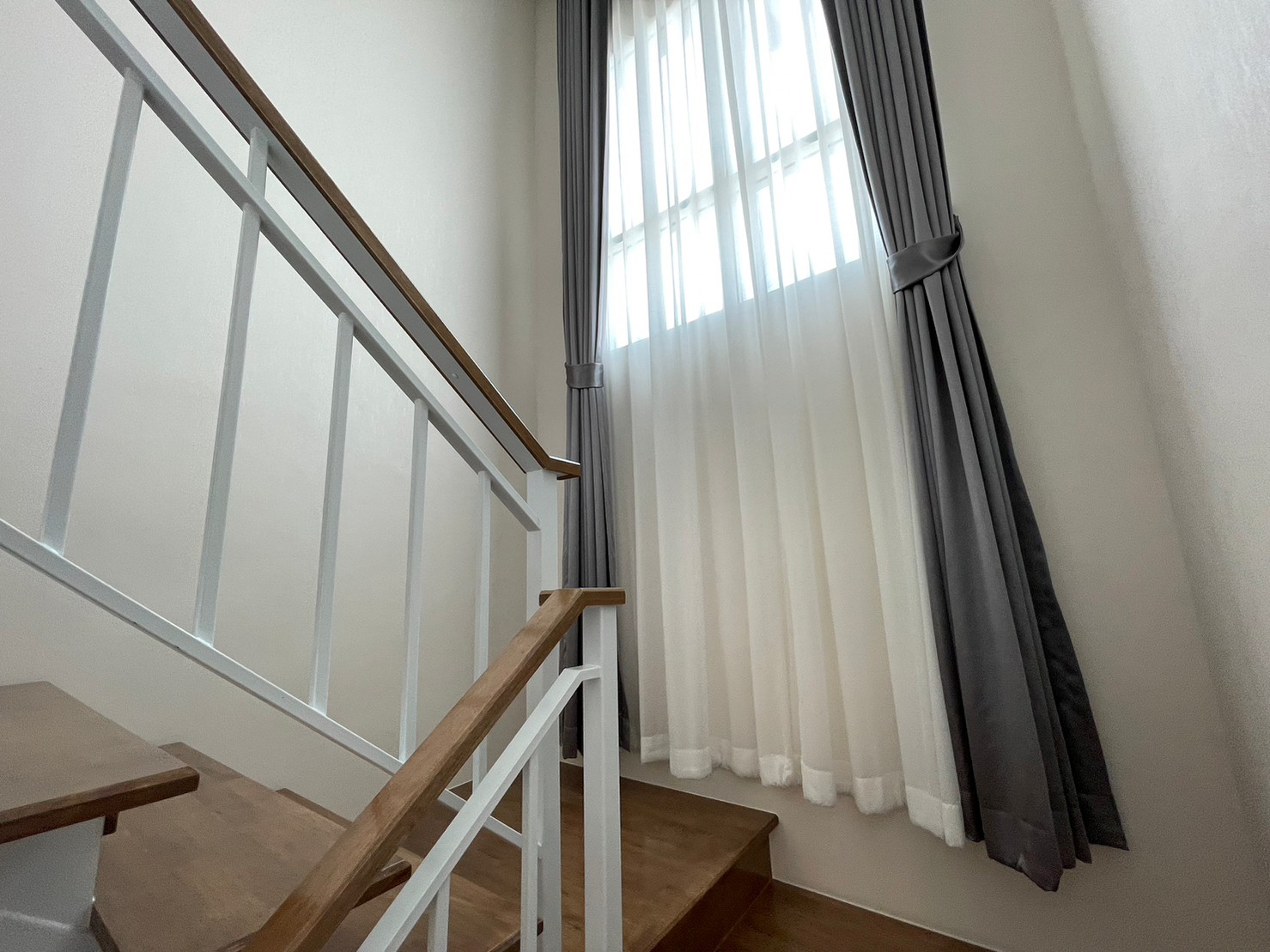 เดินขึ้นมาที่ชั้น 2 จะเจอชานพักสี่เหลี่ยมพื้นผ้าขนาดใหญ่ ทำให้เดินขึ้นลง-ขึ้นสะดวก มองขึ้นไปด้านบนจะมีหน้าต่างขนาดใหญ่ เป็นพื้นที่แสงส่องเข้ามาในตัวบ้าน ทำให้บ้านดูโปร่งโล่งและไม่จำเป็นในการใช้ไฟในเวลากลางวัน