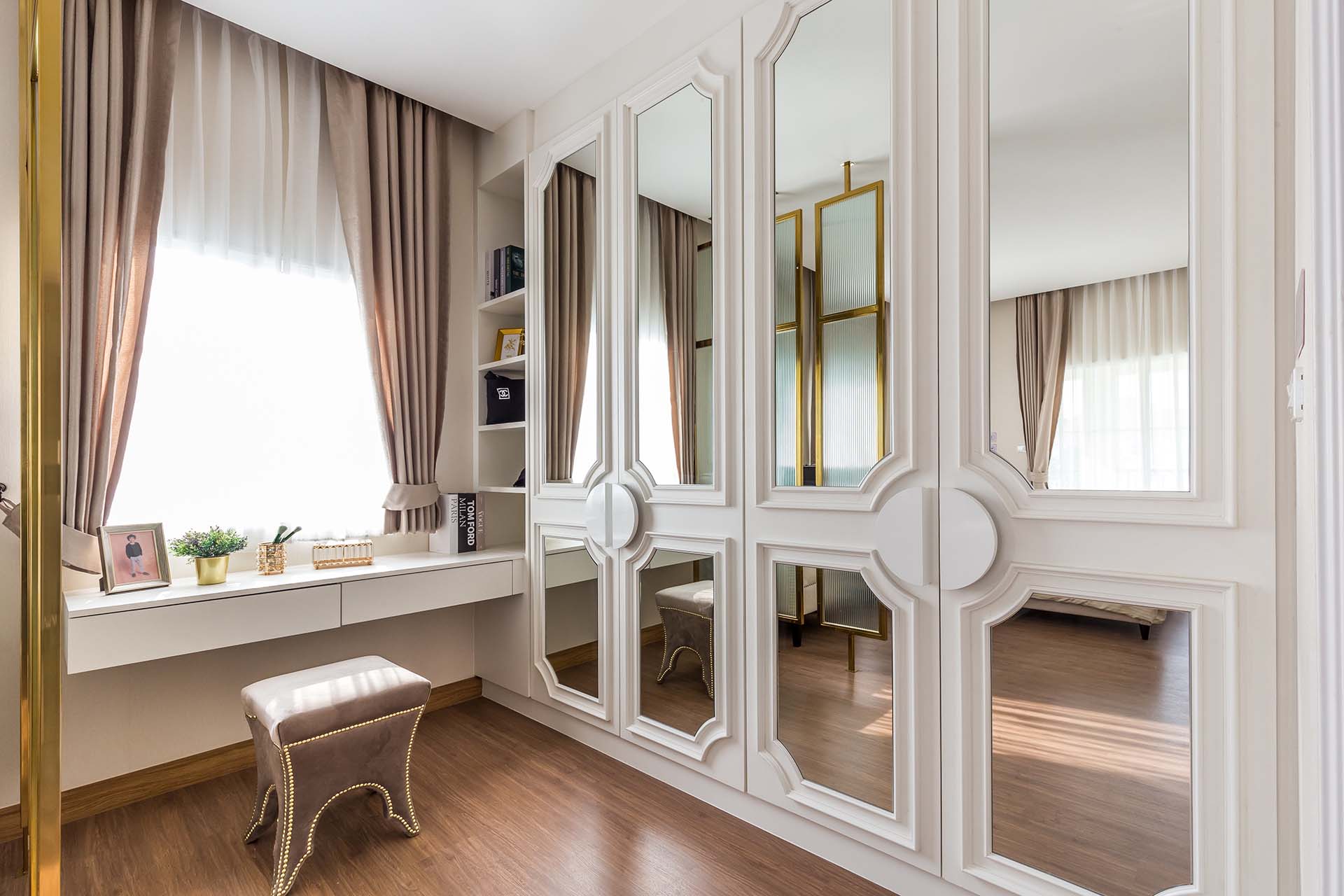 ถัดมาข้างๆ จะจัดเป็นมุมแต่งตัวทำเป็น Walk in Closet ได้ ผนังข้างห้องน้ำสามารถจัดทำเป็นตู้เสื้อผ้า Blut in จำนวน 4 บานได้อย่างลงตัว อีกทั้งยังวางโต๊ะเครื่องแป้งได้ที่บริเวณหน้าต่างได้อีกด้วย