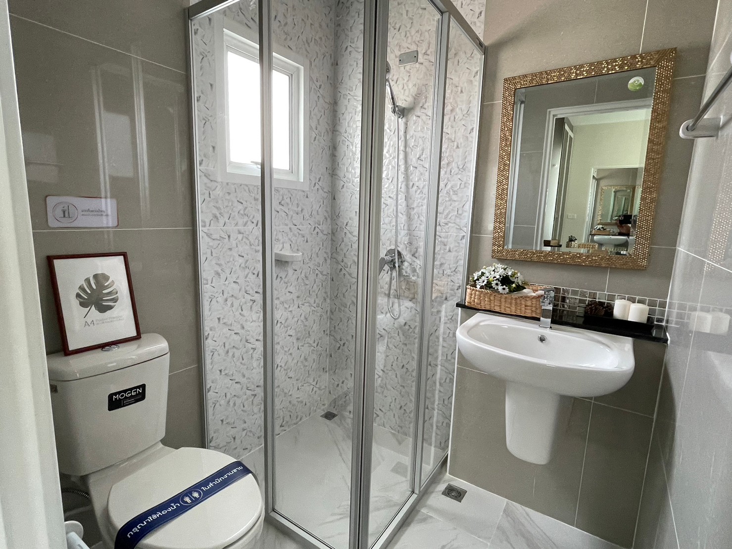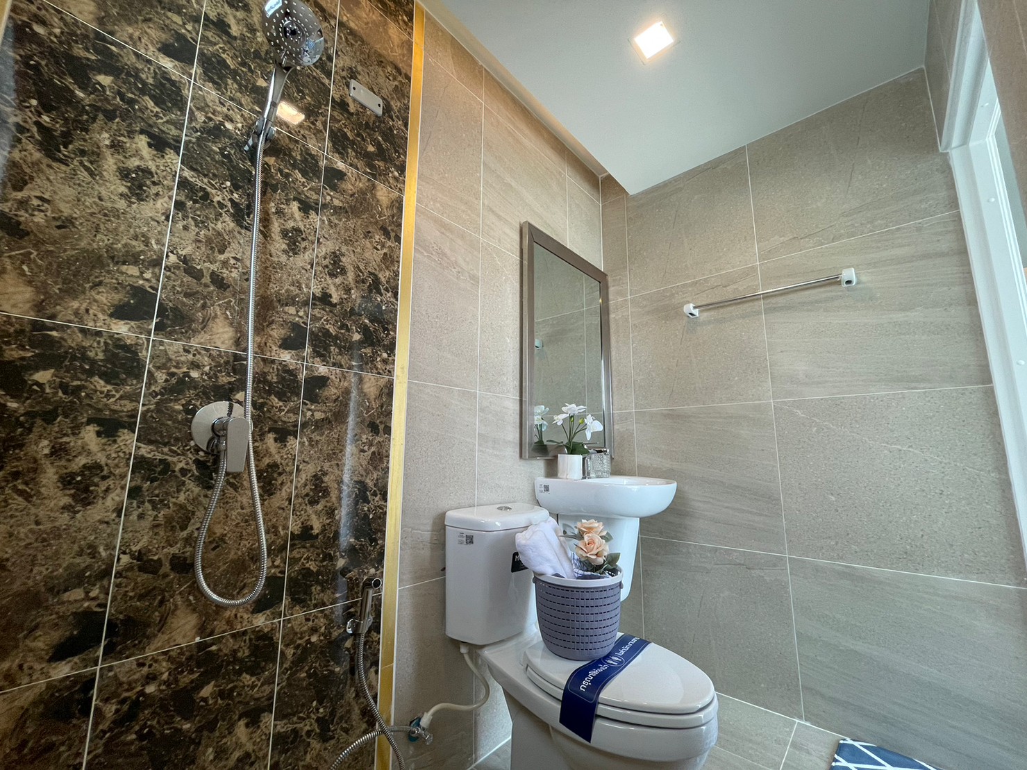 ติดกับพื้นที่ครัวจะเป็นห้องน้ำชั้นล่าง ถือว่าโครงการให้ห้องน้ำมาในขนาดใหญ่พอสมควร ภายในห้องแยกโซนแห้งและเปียกด้วยพื้นต่างระดับ อีกทั้งยังปูพื้นกระบื้องกันลื่นไว้ให้อีกด้วย