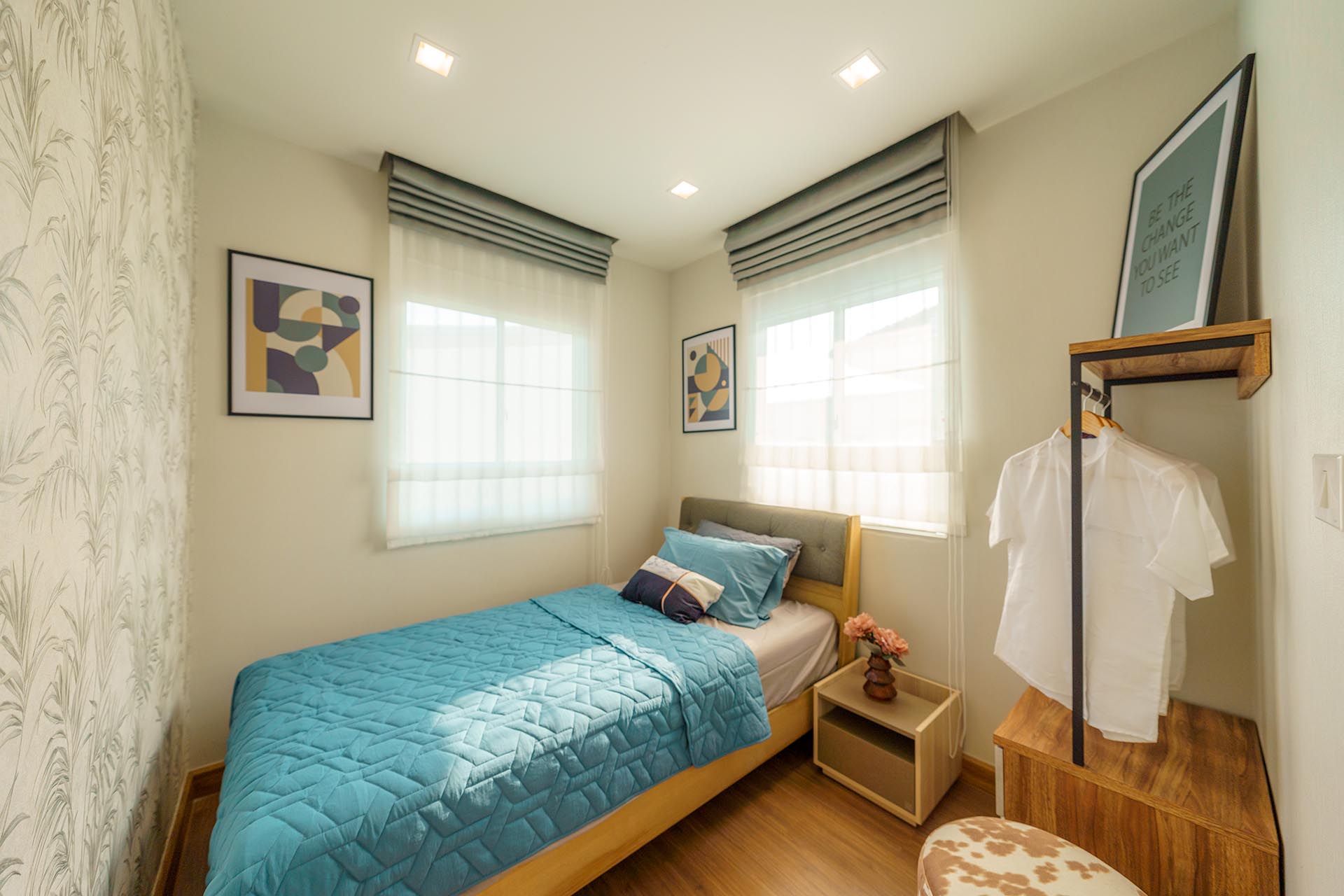 ห้องนอน 3 ขนาดห้องจะเล็กที่สุดสามารถวางเตียง 3.5 - 5 ฟุตได้ บ้านตัวอย่างทำเป็นห้องนอนสำหรับนอน 1 คน โดยใช้เตียงขนาด 3.5 ฟุต จัดวางไว้ตรงกลางห้อง และวางตู้เสื้อผ้า 2 บานติดผนัง และวางโต๊ะทำงานได้บริเวณข้างตู้เสื้อผ้าติดกับประตูห้องได้