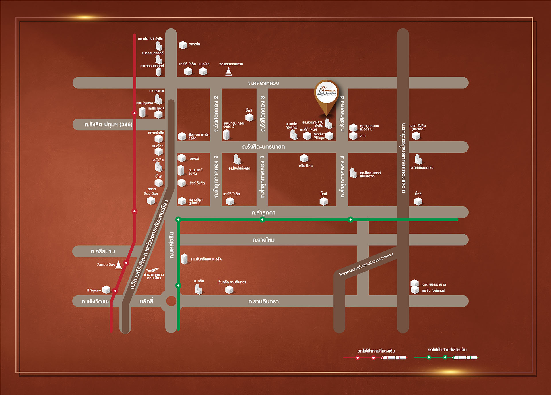 ที่สำคัญเป็นทำเลที่เดินทางสะดวกมากๆ ไม่ว่าจะเป็นรถยนต์ส่วนตัวมีจุดขึ้นลงทางด่วน วงแหวน-รังสิต และทางด่วนเอกมัย-รามอินทรา ร่วมไปถึงรถไฟฟ้าด้วยกัน 2 สาย สายสีเขียว ( คูคต) และ สายสีแดง (รังสิต) และยังมีรถสาธารณะที่วิ่งผ่านบริเวณ ถ.รังสิต-นครนายก ให้เลือกเดินทางได้หลากหลายเส้นทางอีกด้วย