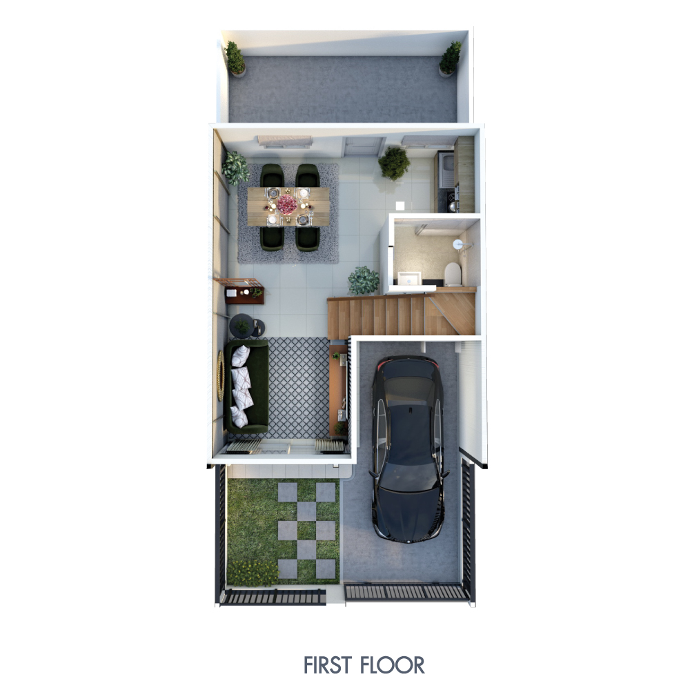 ส่วนแรกของภายในบ้านเป็นพื้นที่ห้องนั่งเล่นหรือส่วนรับแขก มีพื้นที่ระหว่างสองส่วนสามารถจัดเป็น ชั้นวางของหรือโต๊ะทำงานได้ พื้นที่ครัวมีให้แยกต่างหากสามารถกั้นเป็นครัวปิด หลังบ้านเป็นโซนซักล้างสามารถต่อเติมเป็นครัวไทยได้