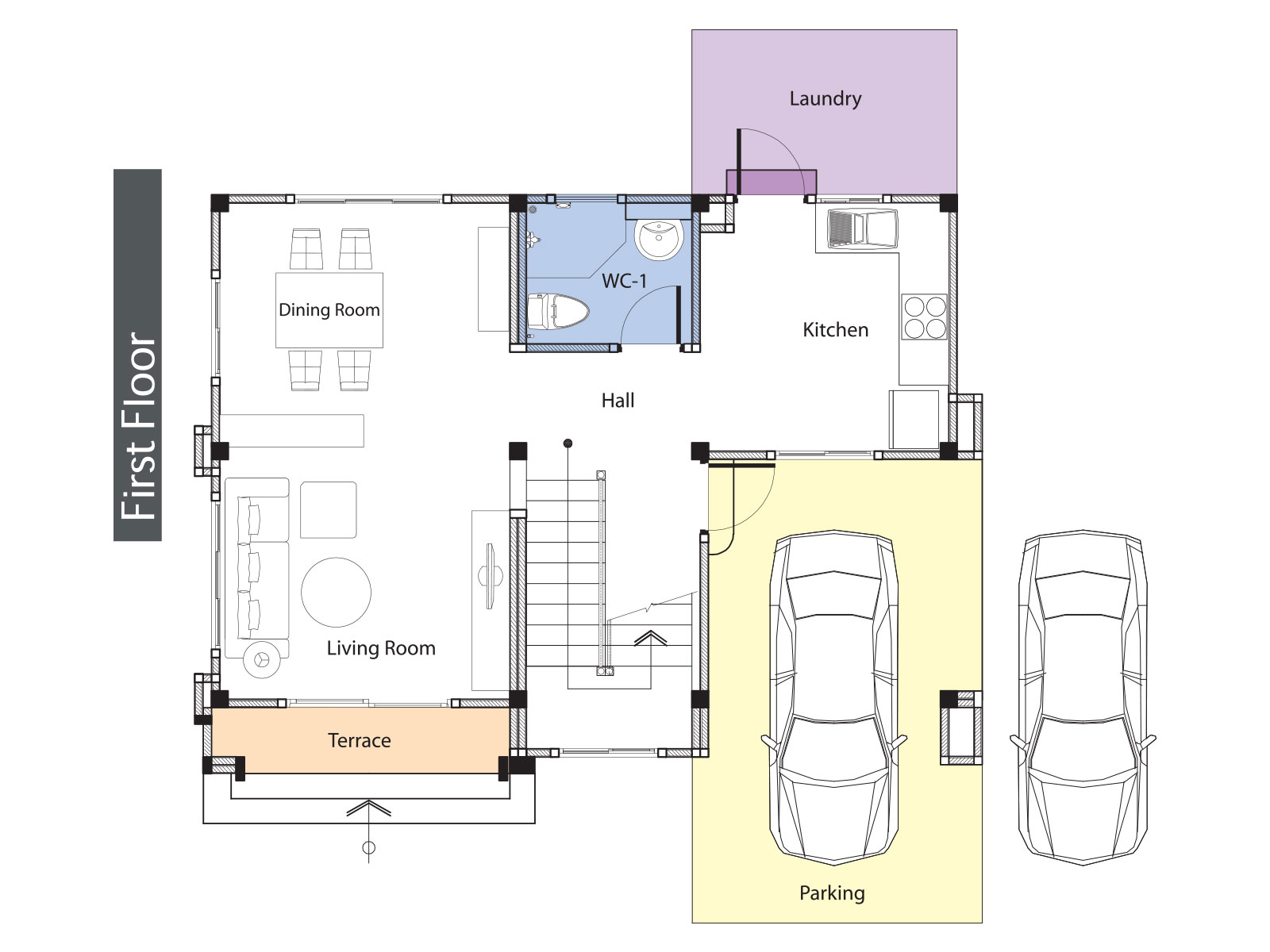 จุดเด่นของแบบบ้าน : ห้องนอนใหญ่ถึง 2 ห้อง / พื้นที่ Living Room กว่า 23 ตร.ม.