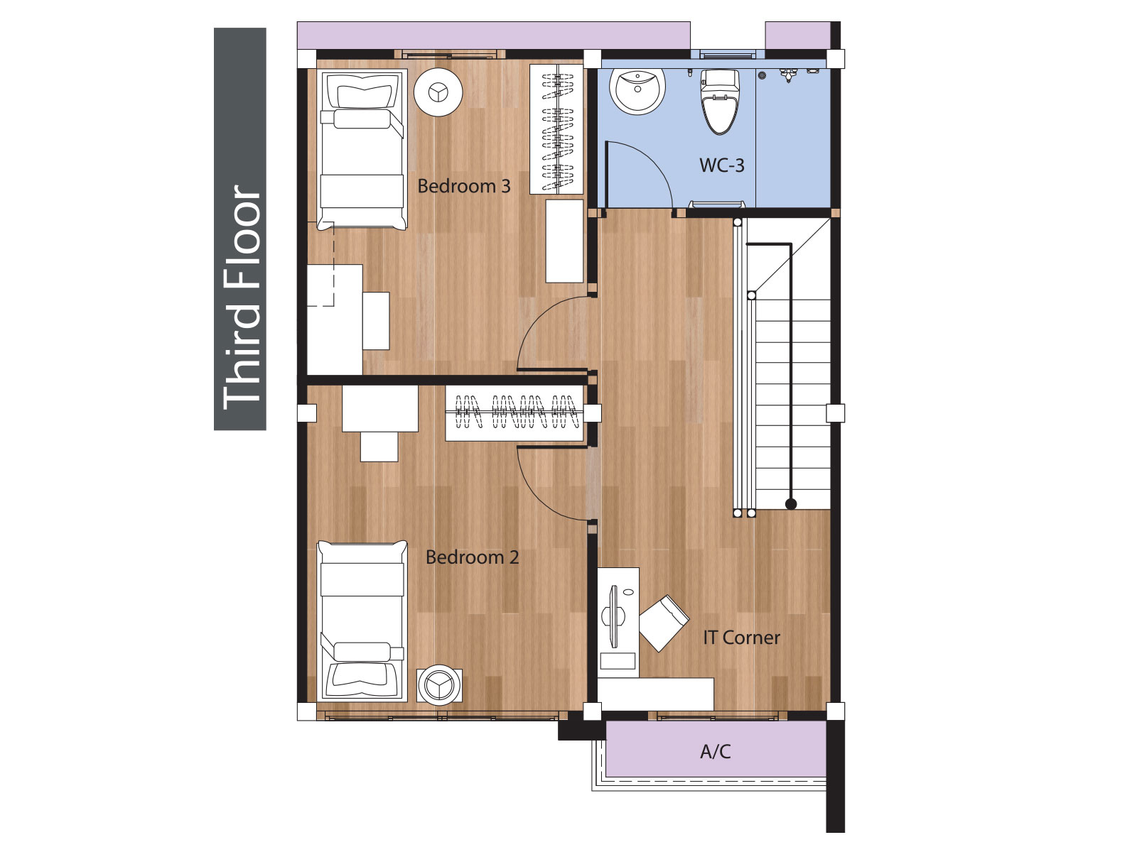 ทาวน์โฮม 3 ชั้น ขนาดพื้นที่ใช้สอย 155 ตร.ม. หน้ากว้าง 5.7ม. 3 ห้องนอน 3 ห้องน้ำ 1 ห้องนั่งเล่น 1 ห้องดูหนัง + มุม IT ส่วนเตรียมอาหาร ที่จอดรถในร่ม 1 คัน